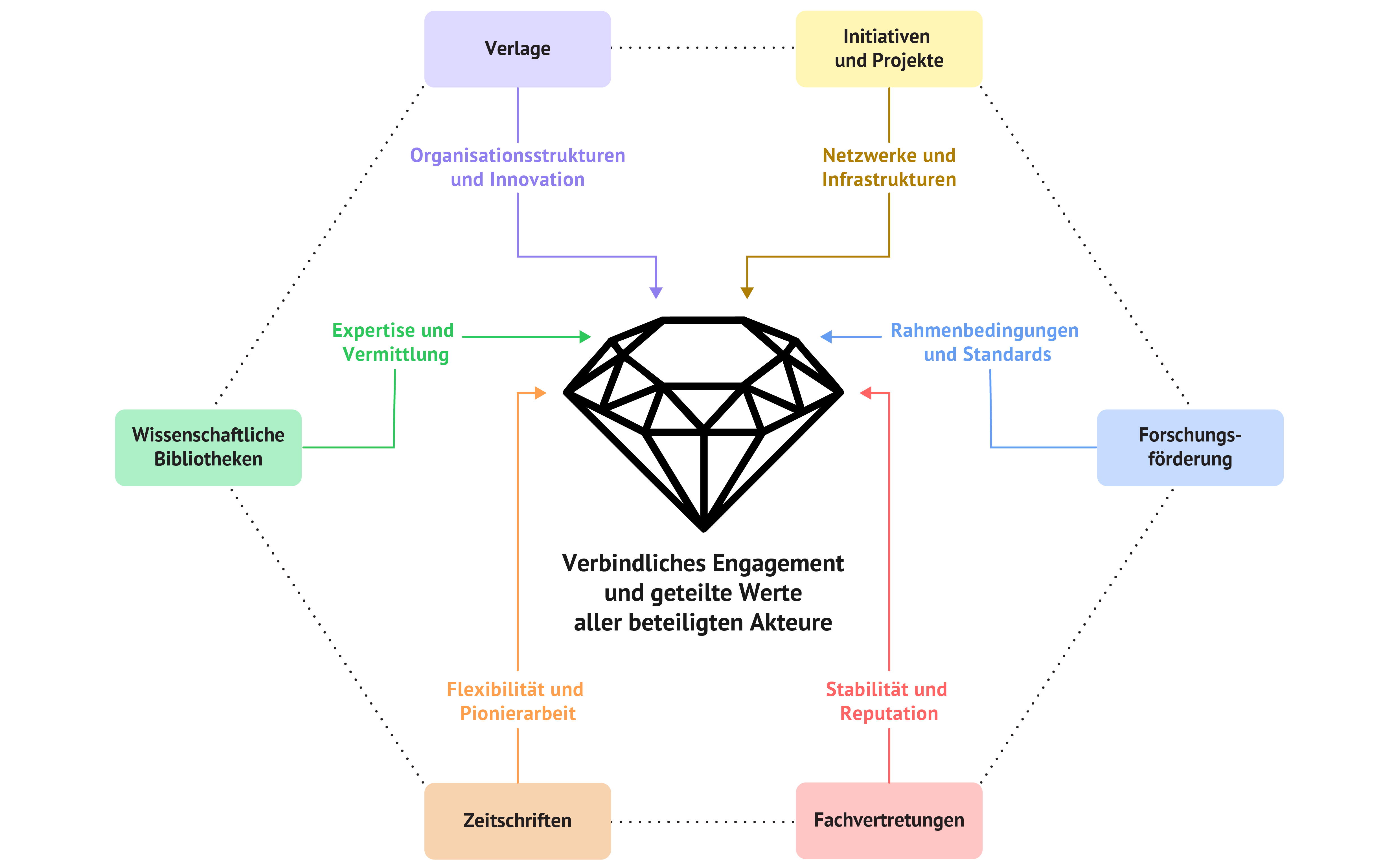 Die sechs Akteursgruppen sind eng miteinander verbunden und arbeiten gemeinsam an fairem Diamond Open Access. Dabei wird Diamond Open Access im Sinne der Definition von Hahn et al. (2023, S. 8) verstanden: