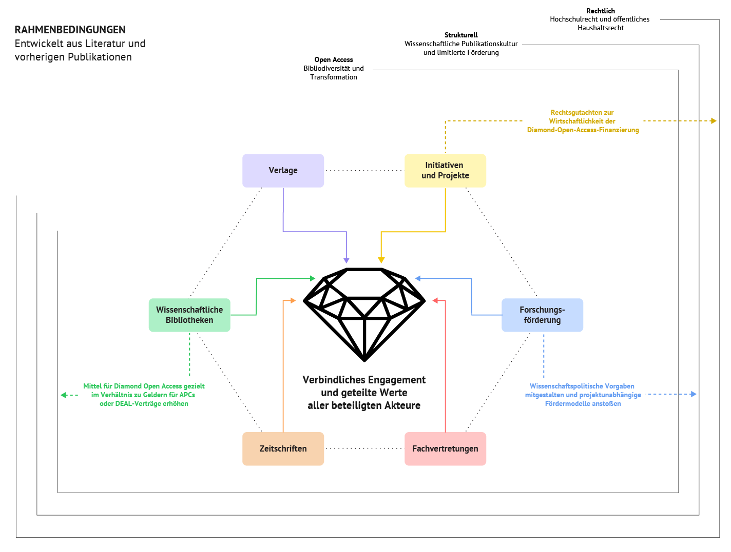 - Rechtliche Rahmenbedingungen umfassen das Hochschulrecht und das öffentliche Haushaltsrecht. Diese setzen nicht nur den rechtlichen Rahmen für das Akteurshandeln, sondern beeinflussen auch die Finanzierung von Diamond Open Access mit öffentlichen Mitteln sowie die Erwerbungslogik einzelner finanzierender Einrichtungen.